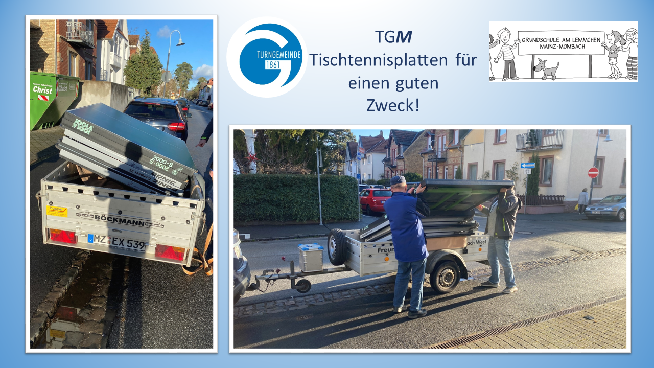 Dank dem Team der Materialwartung unserer Tischtennisabteilung, haben vier neue Platten Einzug in den Spiel- und Trainingsbetrieb der TGM gehalten. Ältere, ausgediente Platten, die nicht mehr für den Sportbetrieb zulässig waren, wurden aussortiert. Damit diese noch bespielbaren Platten nicht einfach auf den Sperrmüll gewandert sind, haben wir ein neues Zuhause für sie gesucht − und gefunden: Die Grundschule, Am Lemmchen in Mombach und die Lenneberg Realschule plus haben die drei Platten sehr gerne genommen und setzen diese nun in ihrem Schulsportbetrieb ein.