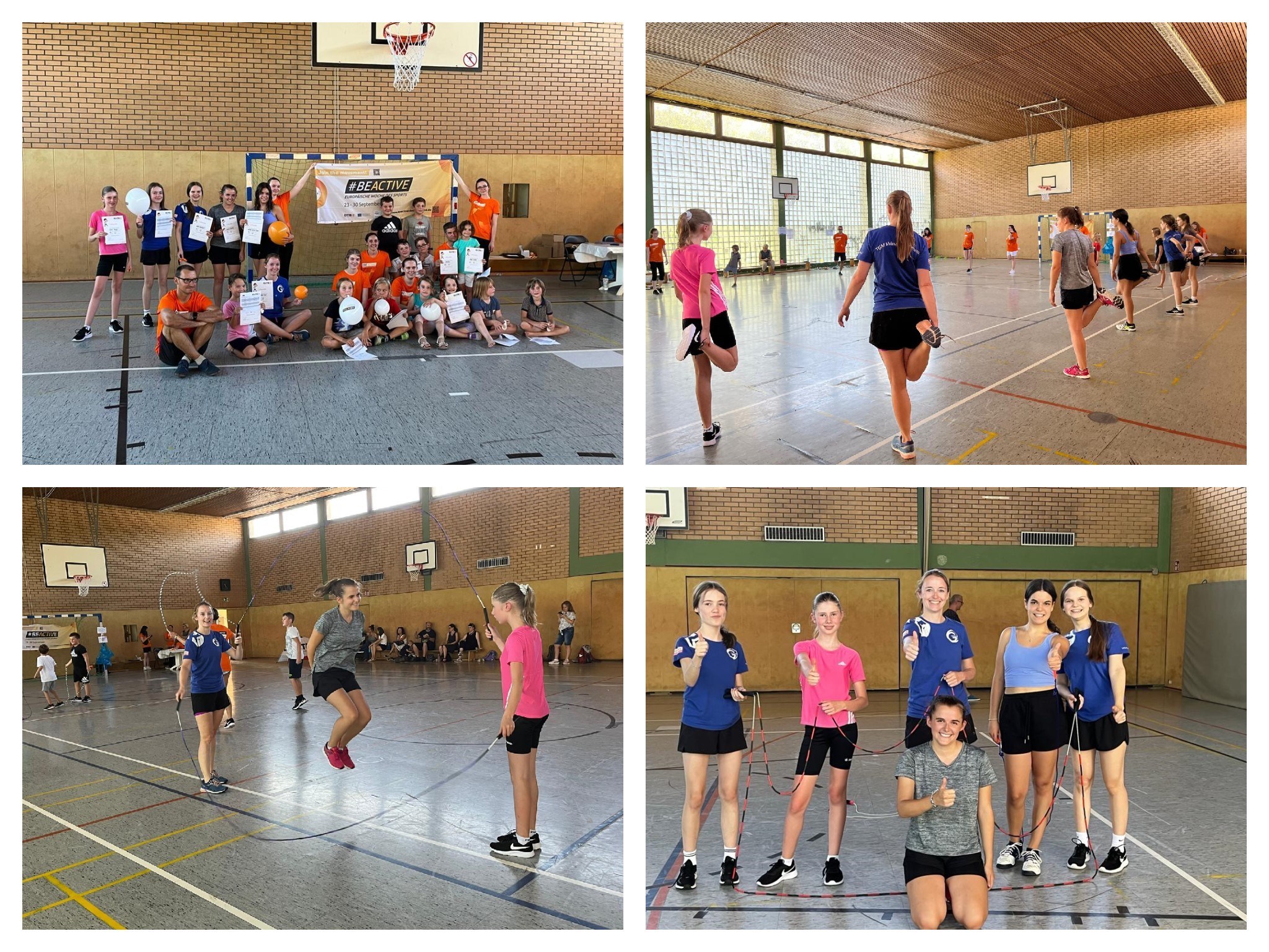 Eine Übungsleiterin des Gastgebenden Vereins spornte alle zu einem kurzen Aufwärmtraining an und dann ging es schon los zu den Stationen. Im Einzel-, Ketten- und Langseil konnte das RhTB “Rope Skipping Abzeichen” erworben werden. Je schwieriger die Sprünge waren, die man schaffte, desto eher konnte man das Abzeichen in Gold erwerben. Weniger gute Springer bekamen es dann in Silber oder Bronze.