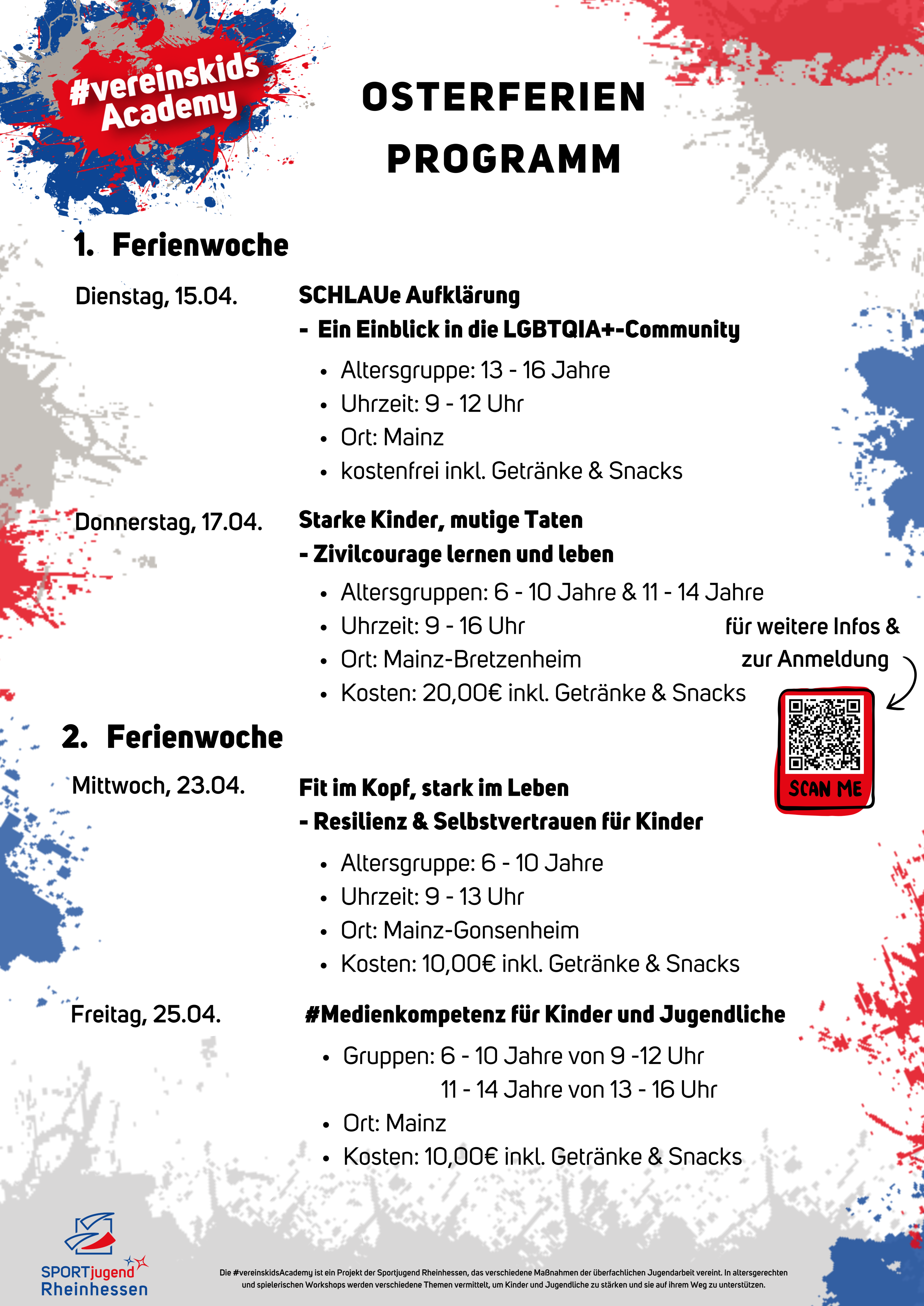 in den Osterferien gibt’s was ganz Besonderes: Im Rahmen der #vereinskidsAcademy werden spannende Workshops für Kinder und Jugendliche von 6 bis 16 Jahren angeboten – kostenfrei, spielerisch und mit wichtigen Themen der Jugendarbeit!