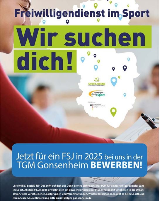 “Freiwillig? Sozial? Ja!” Das trifft auf dich zu? Dann bewirb dich in unserer TGM Gonsenheim für ein freiwilliges soziales Jahr im Sport. Ab dem 01.08.2025 erwartet dich ein abwechslungsreicher Aufgabenplan, mit Einblicken in unseren Verein, viele verschiedene Sportgruppen und Veranstaltungen.
