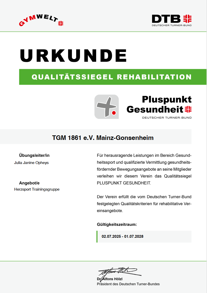 Zusätzlich tragen wir das Qualitätssiegel Pluspunkt Gesundheit.DTB, das vom Deutschen Turner-Bund vergeben wird. Dieses Siegel steht für besonders gesundheitsförderliche Angebote, die von speziell ausgebildeten ÜbungsleiterInnen betreut werden.