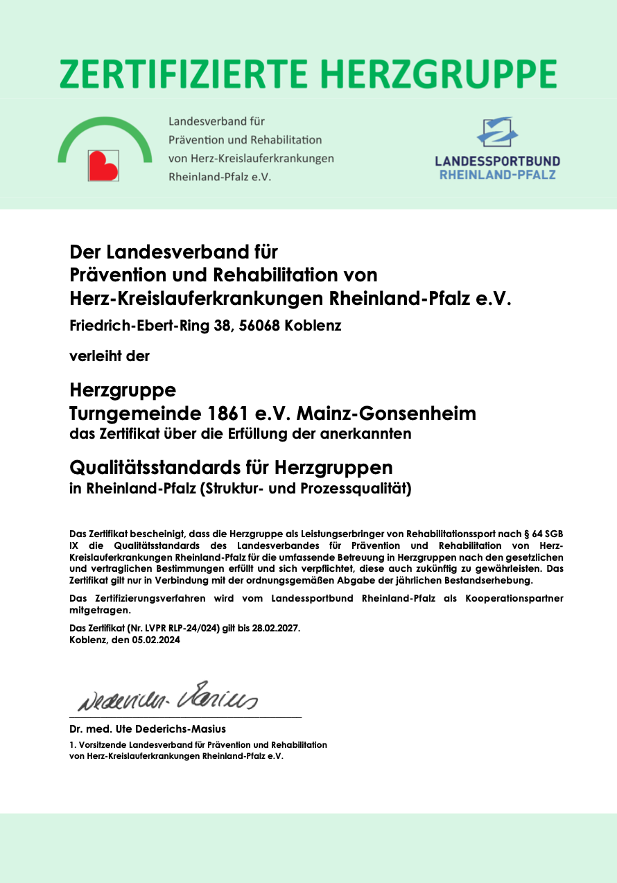 Wir erfüllen die Qualitätsstandards für Herzgruppen in Rheinland-Pfalz. Deshalb sind unsere Angebote im Herzsport-Bereich durch den Landesverband für Prävention und Rehabilitation von Herz-Kreislauferkrankungen Rheinland-Pfalz e.V. zertifiziert!