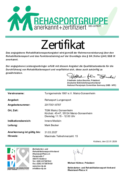 Unsere Rehabilitationssportangebote sind gemäß der Rahmenvereinbarung über den Rehabilitationssport und das Funktionstraining auf der Grundlage des §44 44 SGB IX anerkannt. Unsere Turngemeinde 1861 e.V. Mainz-Gonsenheim erfüllt mit diesem Angebot die Qualitätsstandards für die Durchführung von Rehabilitationssport und verpflichtet sich, diese auch zukünftig zu gewährleisten. Unser Angebot im Rehasport-Bereich Lunge ist durch den BSV zertifiziert