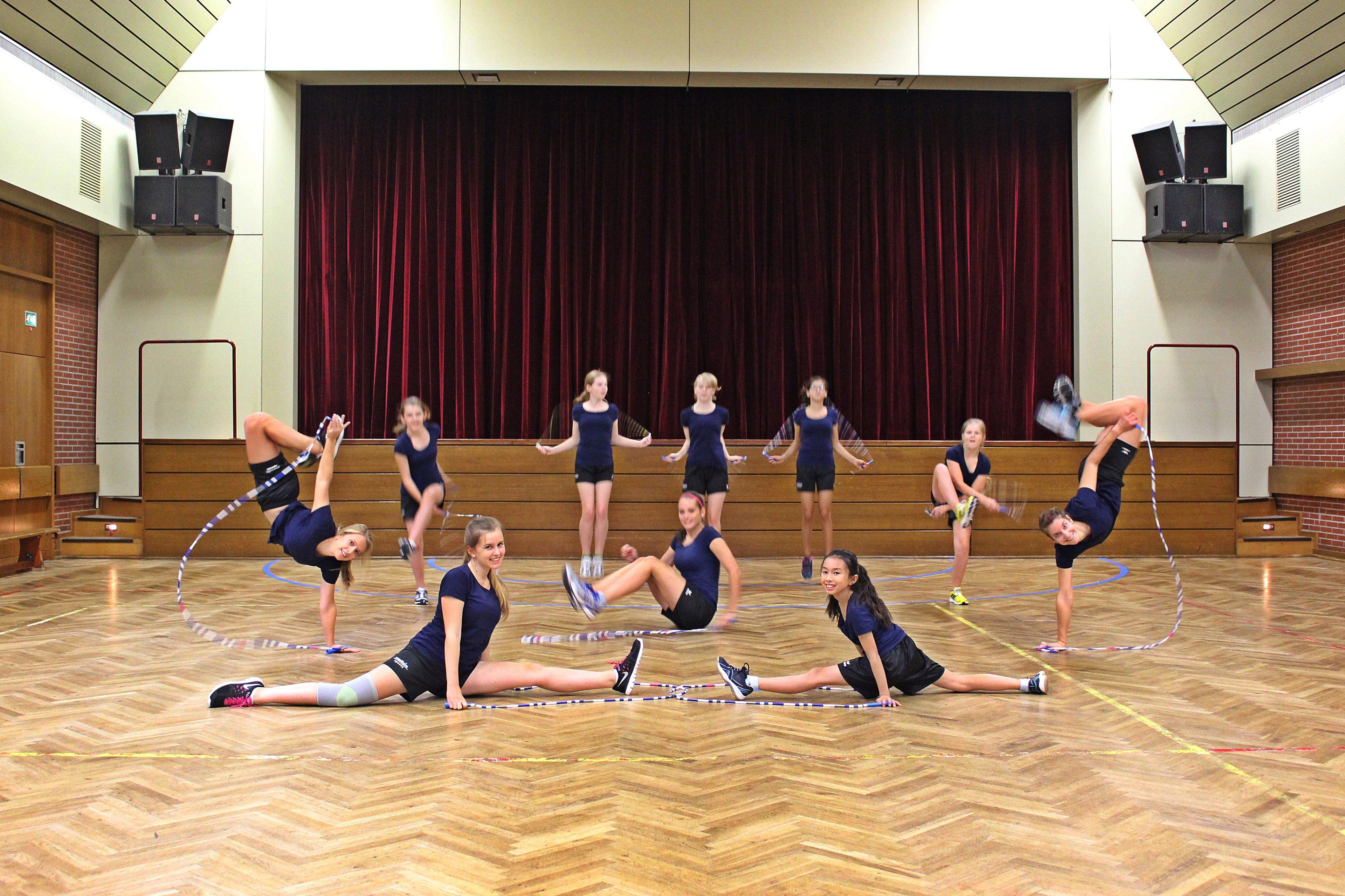 Los ging es mit 40 Mädels in den Altersklassen von 6 bis 32 Jahren beim Jumpday im Otto-Schott-Gymnasium. Organisiert wurde der Tag hauptverantwortlich von Franziska Pister, Fachwartin Rope-Skipping in Rheinhessen. Zusammen mit fünf anderen Trainerinnen konnten an diesem Tag verschiedene Disziplinen wie Double-Dutch, Traveller, Doubles, Wraps oder Cougar geübt und ausprobiert werden. Dabei waren viele neue Tricks und Sprünge dabei, die wir von der TGM noch gar nicht kannten. Zur Auflockerung wurden immer wieder Spiele eingebaut, bei denen man zeigen konnte, wie gut man als Team zusammenarbeitet. Sonntags waren dann die Trainer selbst dran etwas zu lernen: Es ging darum, die D-Lizenz im Rope-Skipping zu erwerben und dabei das Wertungssystem des E4-Wettkampfes zu erlernen. Unsere Übungsleiterinnen Janina Schmitz, Nicole Beckers und Isabell Hach konnten hier erfolgreich die Lizenz erwerben und nebenbei noch viele neue Erfahrungen im Double-Dutch-Wettkampf machen.