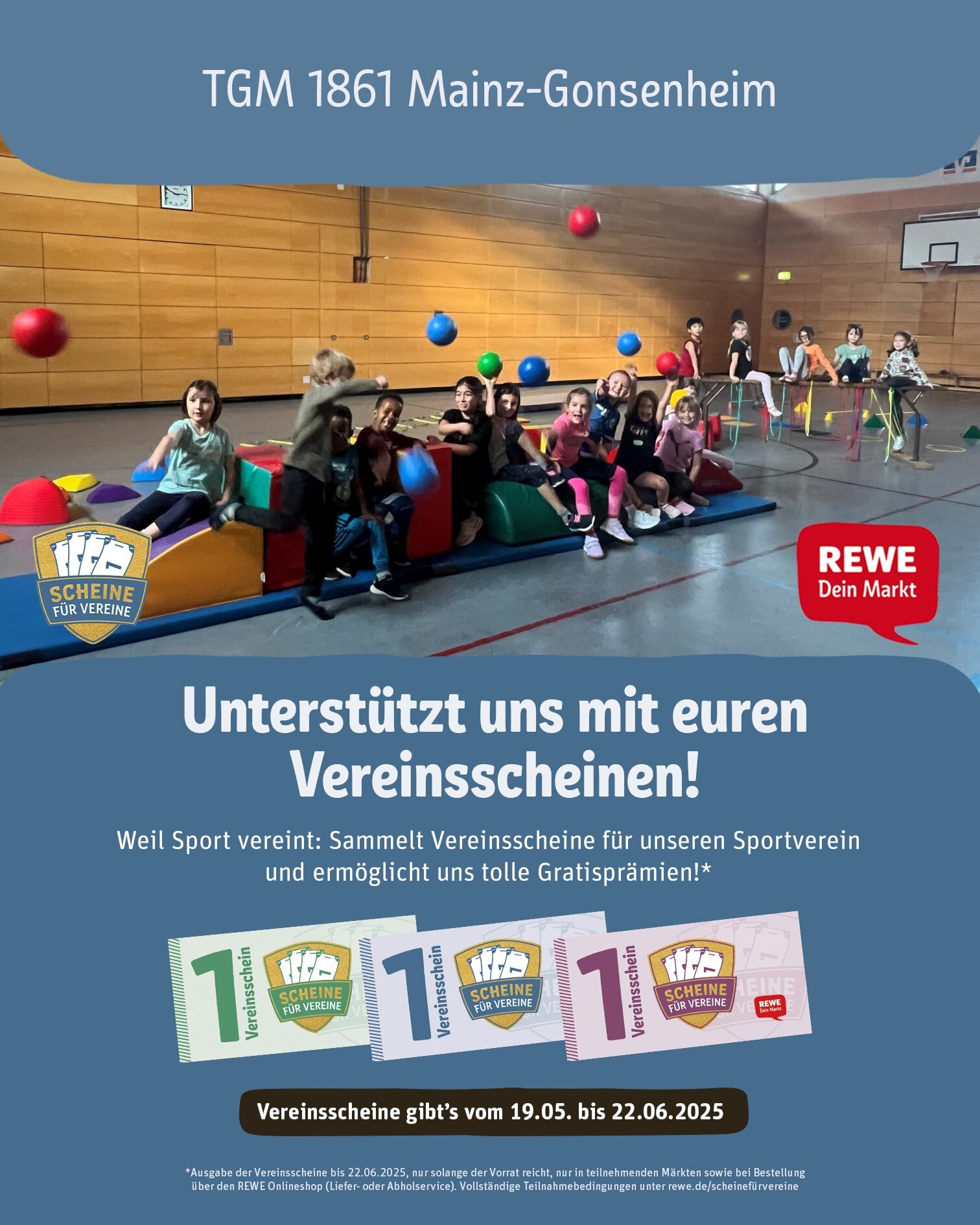 20. Mai 2025 | von Sabrina HoppeEs ist wieder soweit: Vom 19. Mai bis 22. Juni 2025 können bei REWE wieder für unsere TGM Gonsenheim Scheine gesammelt und eingescannt werden. Schon in den letzten Jahren konnten unsere Mitglieder davon profitieren und eine neue Sportausrüstung erhalten. Auf unserer Wunschliste stehen unter anderem: Bälle, Koordinations- und Fitnessgeräte!