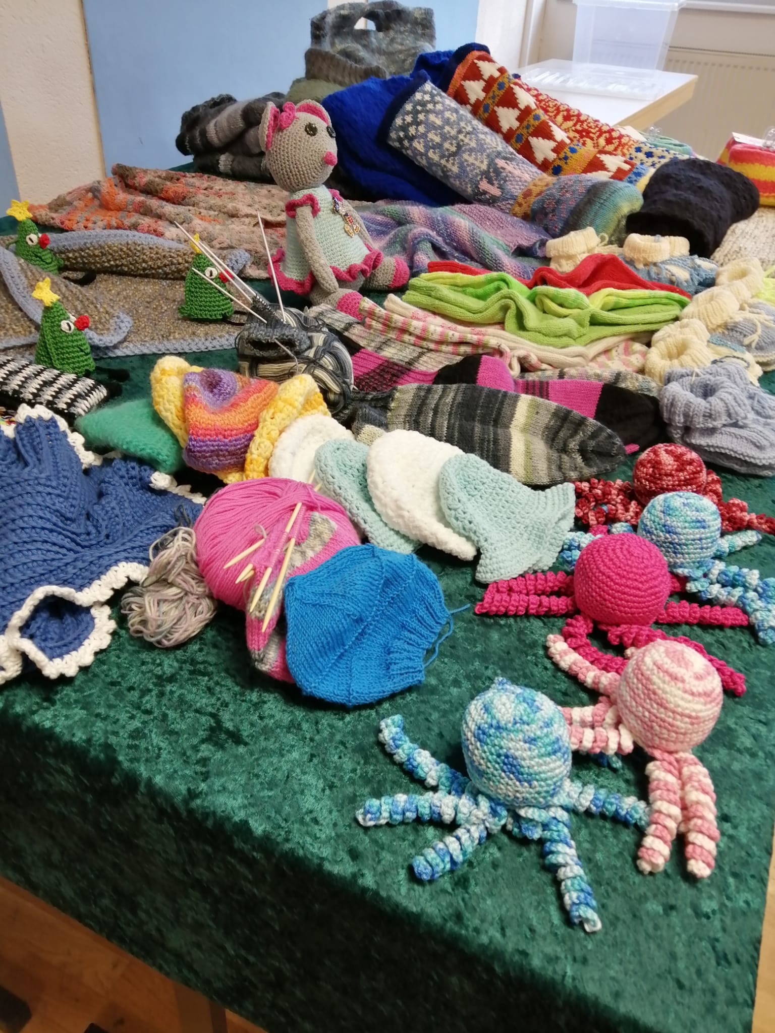 Dadurch angespornt wurde für das nächste Projekt gestrickt. Anfang Februar 2025 konnten wir jede Menge Mützen für Neugeborene im Kreißsaal der Uniklinik Mainz abgeben. Die zuständige Hebamme freute sich natürlich sehr und bestärkte uns, so weiterzumachen. Jetzt klappern wieder jeden Donnerstag die Nadeln. Zur Stärkung gibt es dann auch Kaffee und Kuchen und gute Gespräche.