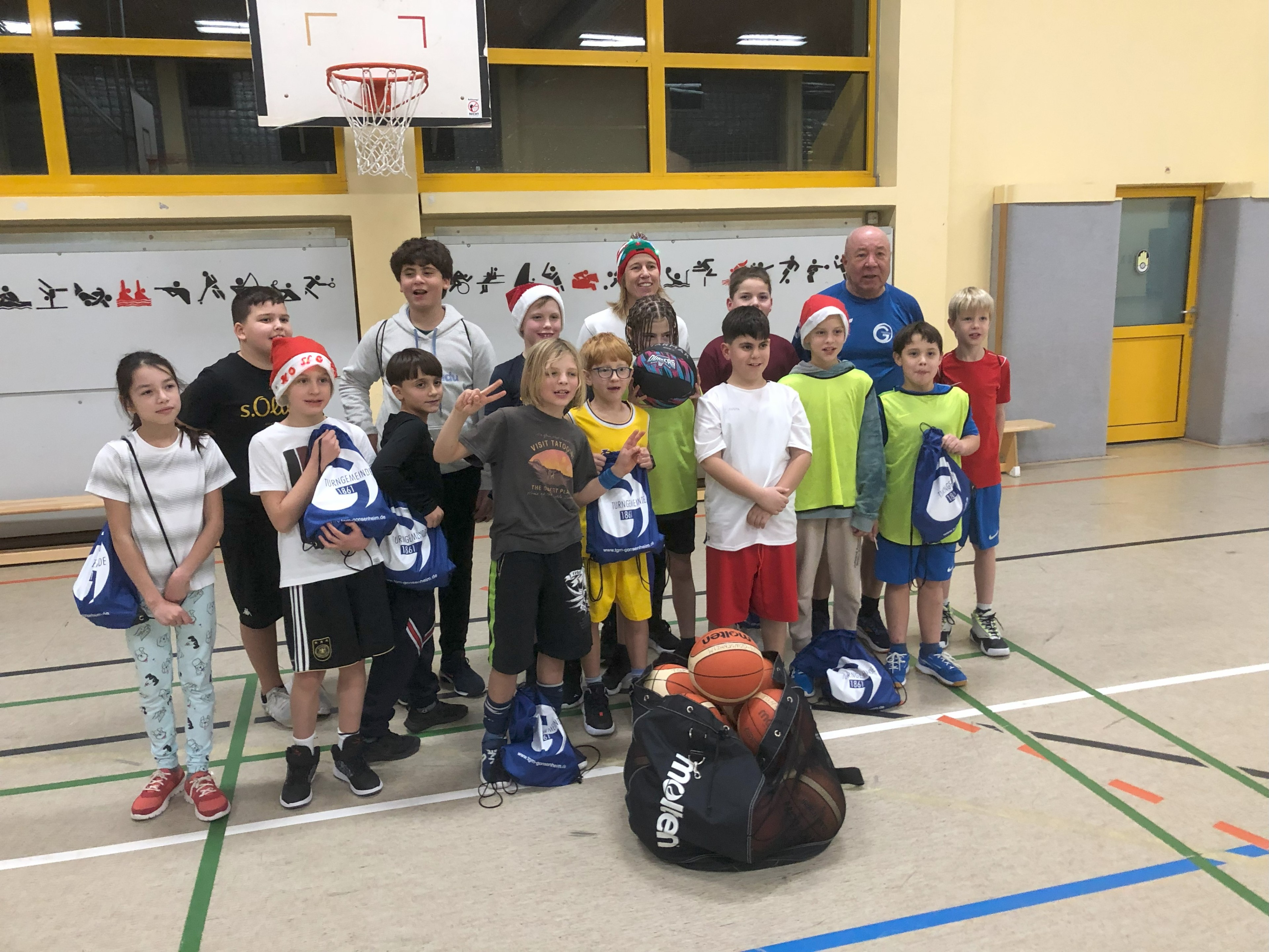 Am 21. Dezember 2023 hatten Isa und Maggi und auch ein paar der nunmehr 14 Kinder eine rote Mütze auf. Weihnachtslieder erklangen und mit dem Ball wurde auch gespielt. Am Ende füllte sich die Turnhalle wie immer mit einem Teil der Eltern. Wir nahmen sie in den obligatorische Schluss-Kreis auf und plauderten noch ein wenig. Für jedes Kind hatten wir einen blauen Turngemeinde-Sportbeutel mitgebracht. Darin unter anderem: eine TGM Tasse, Wallnüsse, Schoko-Weihnachtsmann, Äpfel, Knoppers … selbst Goldbären hüpften im Beutel. Und alle staunten nicht schlecht, dass der 1. Vorsitzende Andreas Maurer die kleine Weihnachtsüberraschung verteilte.