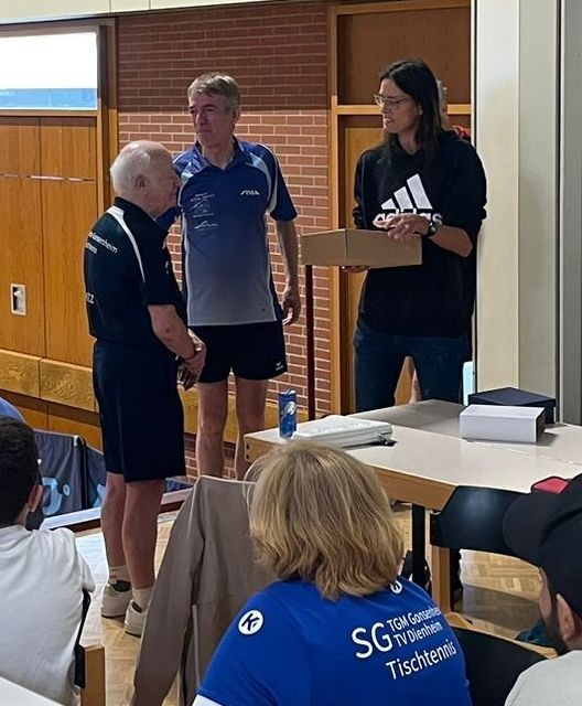 Der Abteilungsleiter Roger Becker unterbrach gegen Mittag das laufende Turnier für eine besondere Feierlichkeit. Zu Ehren unseres Mitglieds Gerhard Dietz, der einige Tage zuvor seinen 90. Geburtstag feiern konnte, überreichte Wiebke Fabinski als Vertreterin des TGM Vorstands dem Jubilar ein Weinpräsent, begleitet von den Glückwünschen im Namen der TGM Gonsenheim. Der Abteilungsleiter überreichte noch ein besonderes, vom stellvertretenden Abteilungsleiter Stefan Richter vorbereitetes Geschenk: einen würdigen Ehrenpokal im Namen seiner Vereinskameraden. In seiner kurzen spontanen Ansprache (das Turnier musste ja auch weitergehen) ehrte Roger unser ältestes Mitglied als überaus aktiven und ungebrochen ehrgeizigen Tischtennis-Kameraden, dem wir noch viele Jahre in unserer Mitte wünschen.