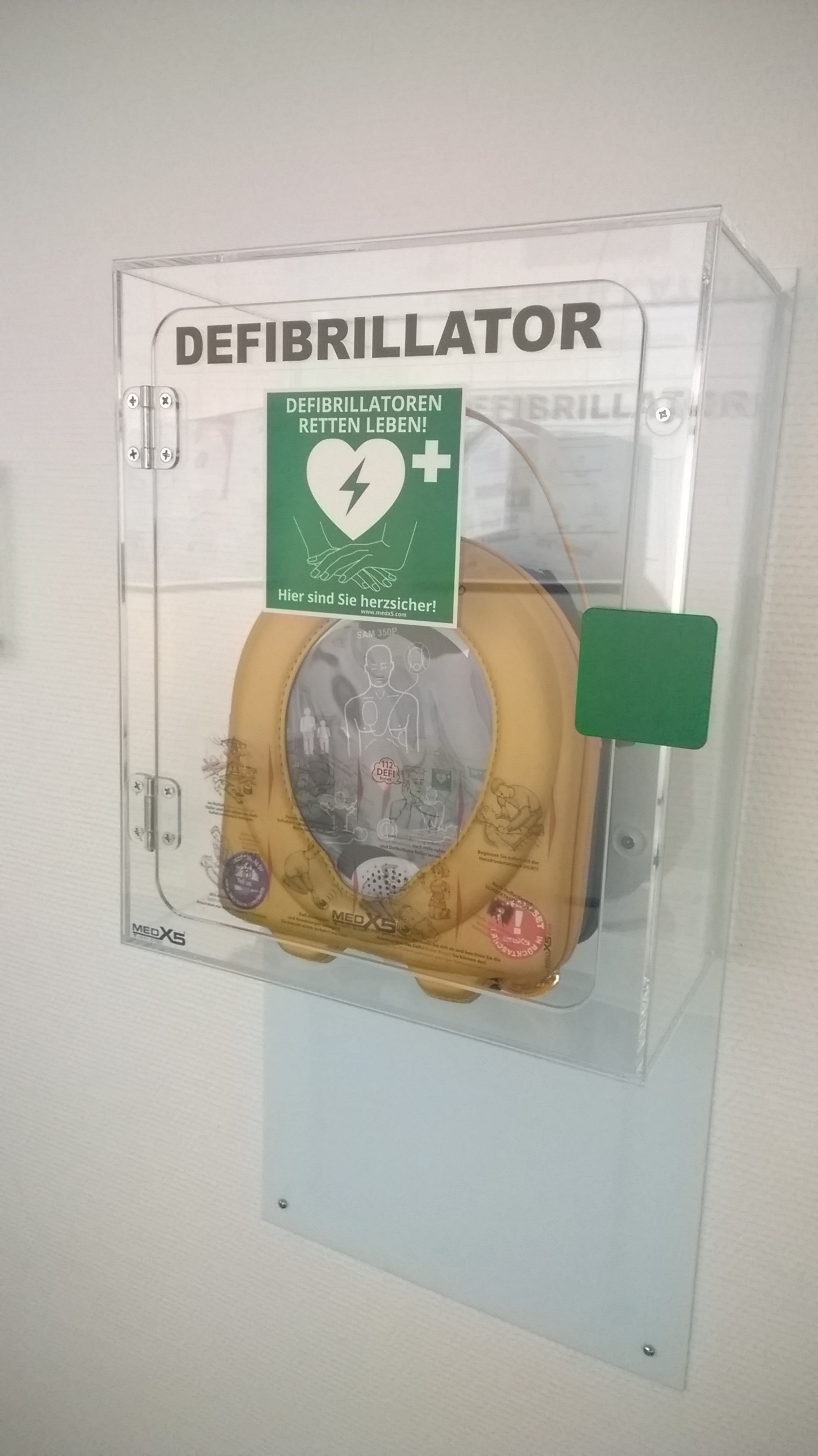 Der Defi hier in der TGM ist frei zugänglich und kann nicht nur in den Herzsportgruppen eingesetzt werden. Er befindet sich im Flur neben der Behindertentoilette.
